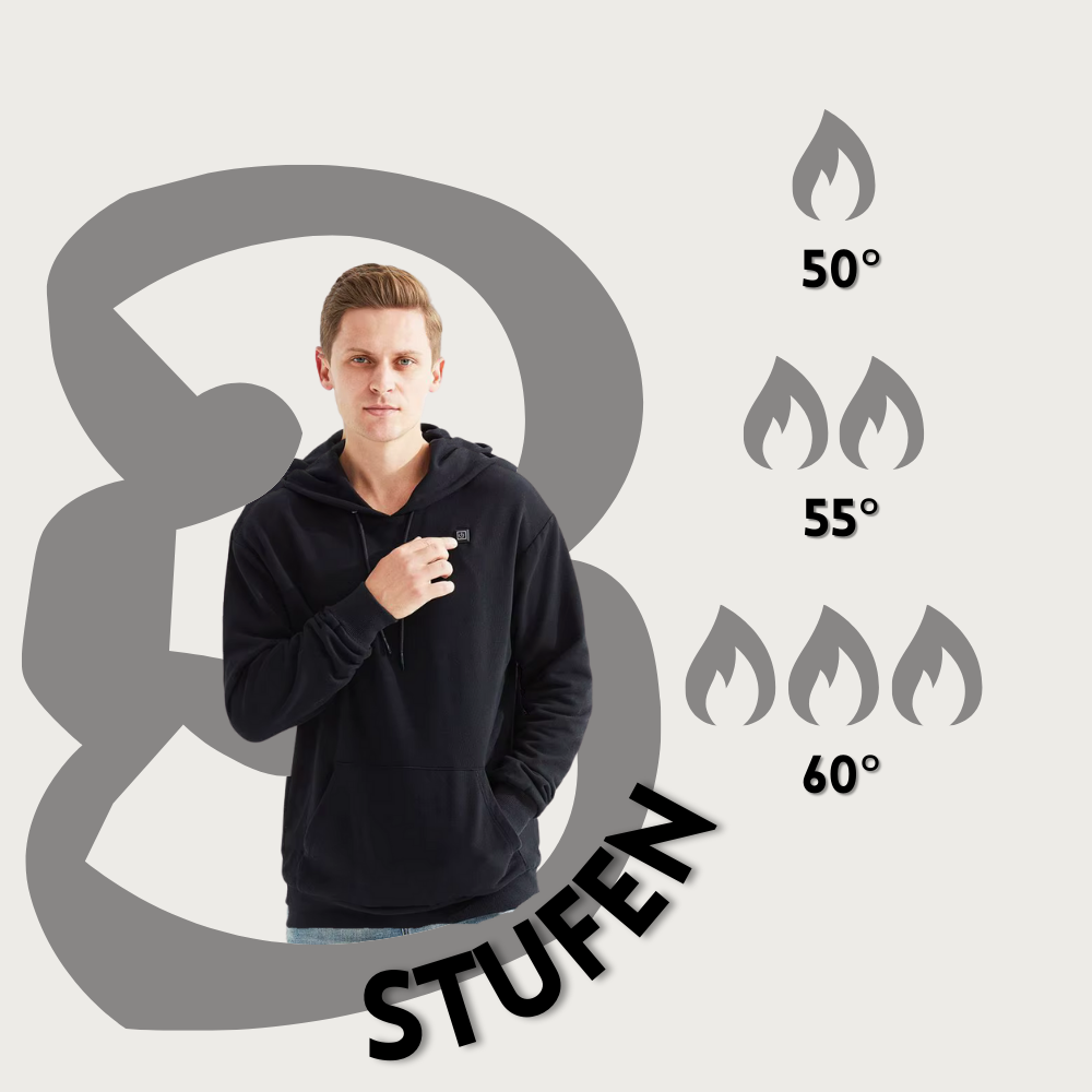 Mit unserem beheizbaren Hoodie bekommst du per Knopfdruck sofortige Wärme über 5 Zonen und 3 Stufen – genau so, wie du es magst.